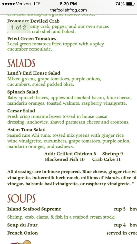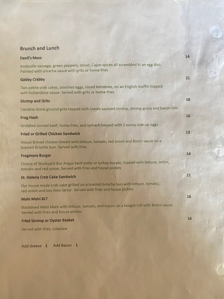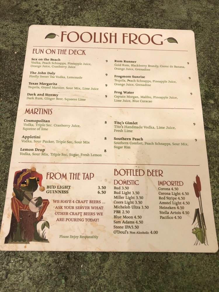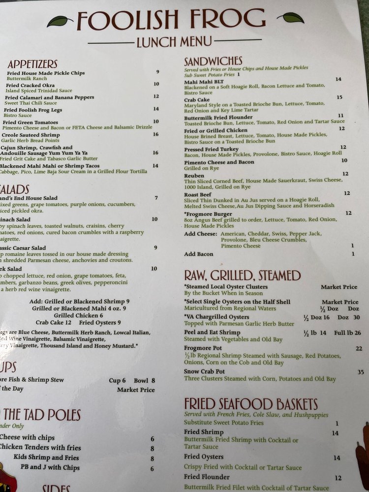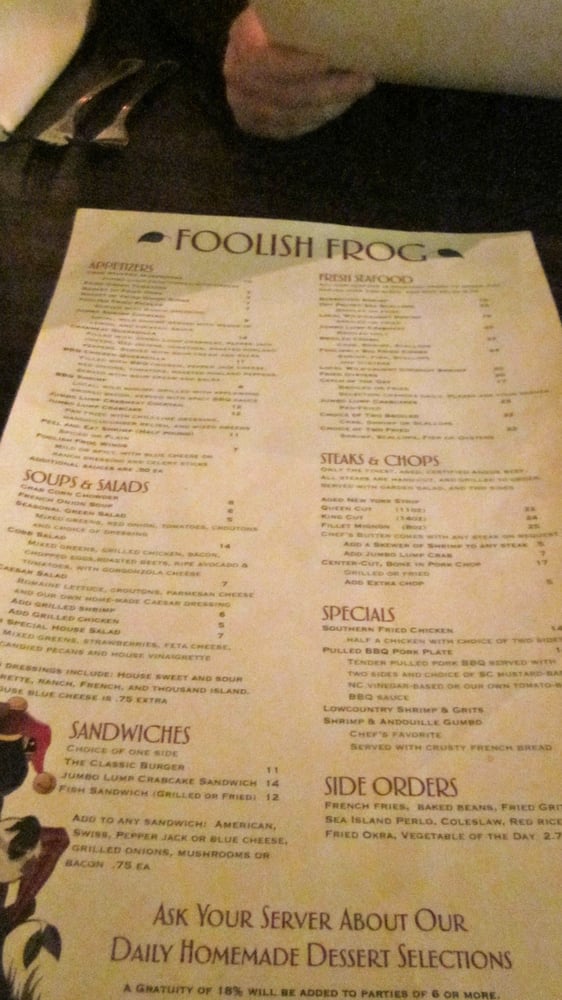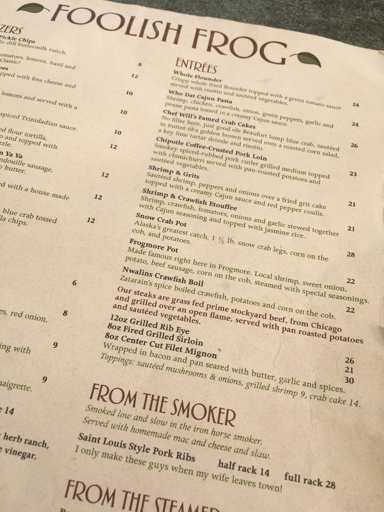 Introducing Foolish Frog, a New American - Seafood restaurant located at 846 Sea Island Pkwy in Saint Helena Island, SC. Offering a variety of options, from shrimp and grits to seafood platters, Foolish Frog caters to both meat lovers and vegetarians. The casual setting with outdoor seating makes it perfect for groups and families, with the added bonus of a view overlooking the marsh. Customers rave about the delicious food, with highlights including the shrimp tacos and fried cracked okra. While some note that the shrimp can be a bit salty, the overall dining experience is top-notch. Don't miss out on trying the baja sour cream sauce and soaking in the ambiance of dining by the swamp at Foolish Frog.